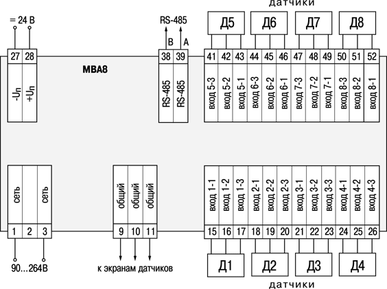 Модуль ввода МВА8 работает в сети RS-485 при наличии в ней «мастера», при этом сам МВА8 не является «мастером» сети.