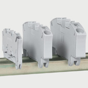 - с болтовыми выводами для шин и кабелей с наконечниками. Фиксация металлической защелкой на рейке DIN глубиной 15 мм и несимметричной рейке, соответствующей EN 60715.