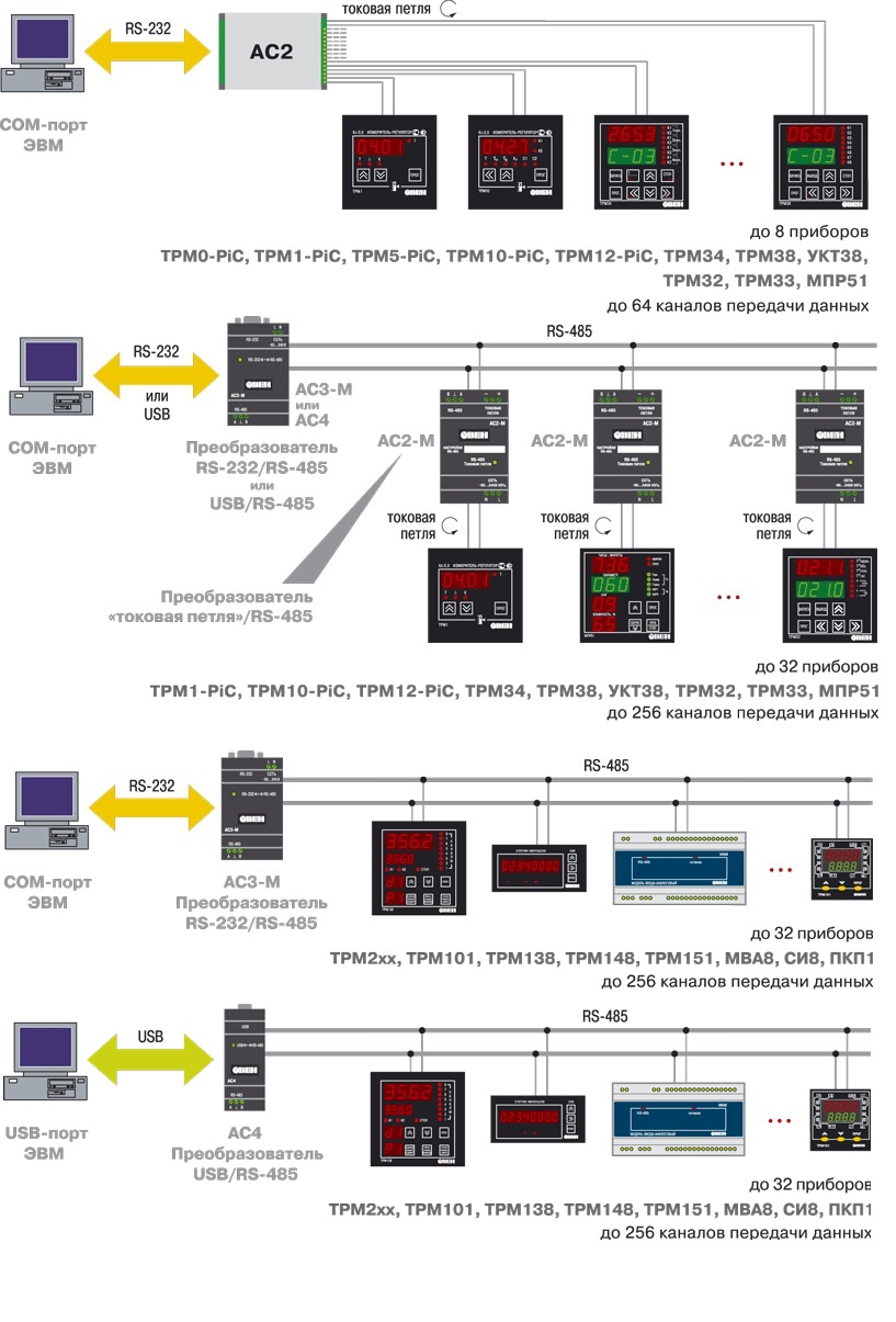 - Через преобразователь АС2-М прибор подключается к сети RS-485, которая, в свою очередь, через адаптер АС3-М, АС3 или АС4 может быть подключена к ПК. К каждому преобразователю АС2-М подключается один прибор типа ТРМ1-PiC, ТРМ38, МПР51 и т. п. Максимальное количество каналов отображения для одного порта (при использовании восьмиканальных приборов типа УКТ38 или ТРМ38) равно 256.