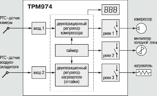 Для поддержания температуры в камере ТРМ974 управляет работой компрессора и вентилятора.